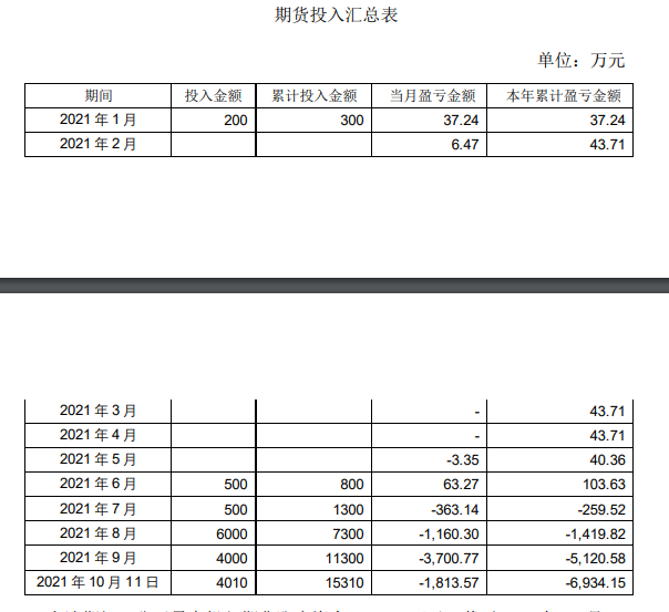 但进入下半年后,豪悦护理期货投资规模迅速放大,而收益却由盈转亏。7月份,豪悦护理就投入500万元,投资额接近上半年累计金额的62.5%,但当月亏损363.14万元,抛开上半年累计盈利金额后,还倒亏了259.52万元。8月、9月至10月11日期间,豪悦护理期货投资额剧增,分别达到6000万元、4000万元和4010万元。