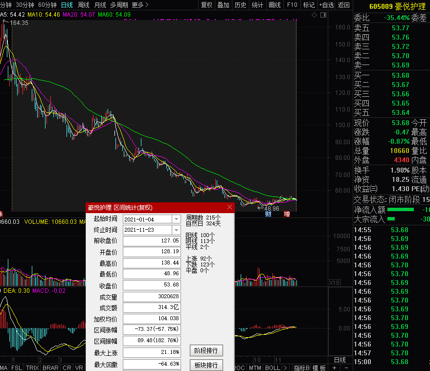 2021年以来,豪悦护理股价持续走低,已从年初的130元/股附近,下跌至53元/股一线,最大回撤幅度达到64.63%。持续低迷的行业也让豪悦护理有了行动,10月13日晚间发布公告称,上市公司拟以1.4亿元至2亿元回购公司股份,回购价不超过每股75元,折合股份占公司总股本的1.17%至1.68%。