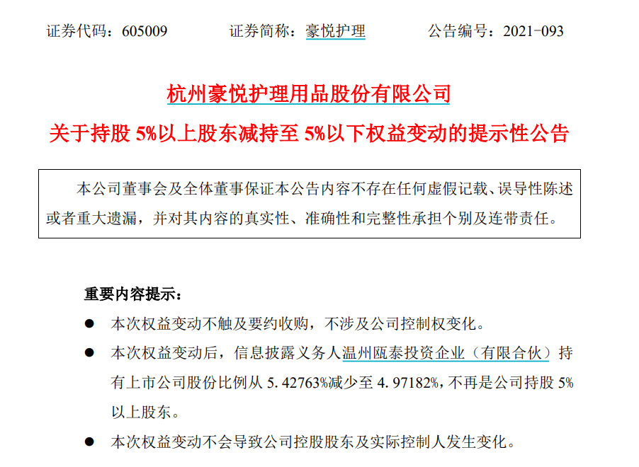 近期,豪悦护理披露公告称,大股东温州瓯泰再度减持股份72.86万股,其持股比例减少至4.97%,不再是公司持股5%以上的股东。实际上,温州瓯泰自2021年9月限售股解禁后持续减持,近2个月累计减持232.7万股,变现金额约达1.28亿元。