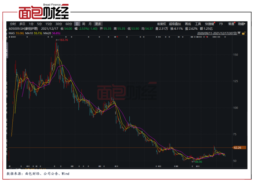 豪悦护理股价于2021年下半年跌破发行价62.26元/股,截至2021年12月17日收盘,公司股价收于54元/股,总市值为86亿元,较去年股价最高时蒸发逾160亿元。