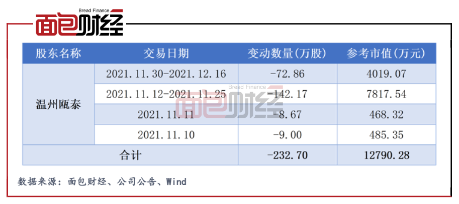 2021年11-12月,温州瓯泰累计减持公司股份232.7万股,变现金额约1.28亿元,其持股比例由6.46%减少至4.97%,不再是公司持股5%以上的股东。