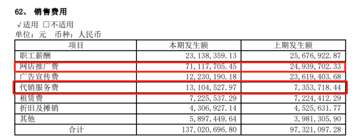 销售费用大幅增加是导致公司利润增幅有限的一个重要原因。2023年,公司销售费用达到1.37亿元,同比增长超过四成,其中网店推广费大幅增长,达到7000多万元,同比增幅185%,几乎增长两倍,代销服务费也大幅增长。但从当年的实际效果来看,产品推广力度加大并未带来总体业绩的增长。