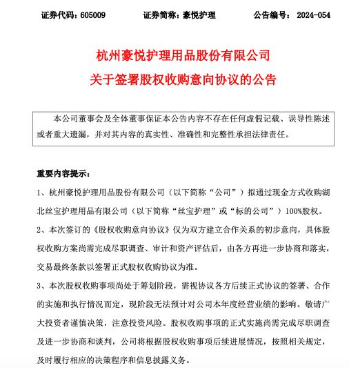 10月25日,杭州豪悦护理用品股份有限公司(以下简称“豪悦护理”或“公司”)发布关于签署股权收购意向协议的公告。公告称,公司拟通过现金方式收购湖北丝宝护理用品有限公司(“丝宝护理”或“标的公司”)100%股权。根据初步评估,丝宝护理的综合估值暂定为不超过人民币3.6亿元。