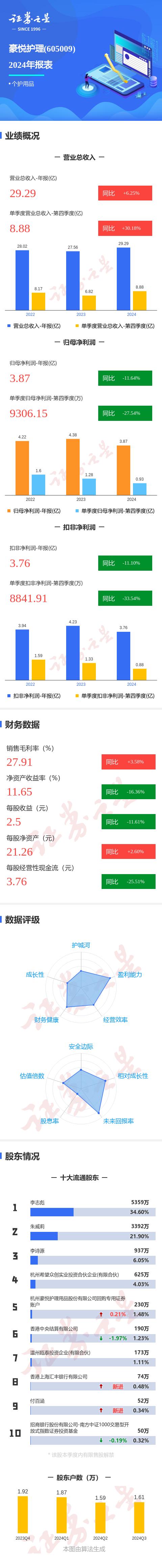 豪悦护理2024年年报显示,公司主营收入29.29亿元,同比上升6.25%;归母净利润3.88亿元,同比下降11.65%;扣非净利润3.76亿元,同比下降11.1%;其中2024年第四季度,公司单季度主营收入8.88亿元,同比上升30.19%;单季度归母净利润9306.16万元,同比下降27.55%;单季度扣非净利润8841.91万元,同比下降33.55%;负债率31.96%,投资收益70.03万元,财务费用-3709.54万元,毛利率27.91%。