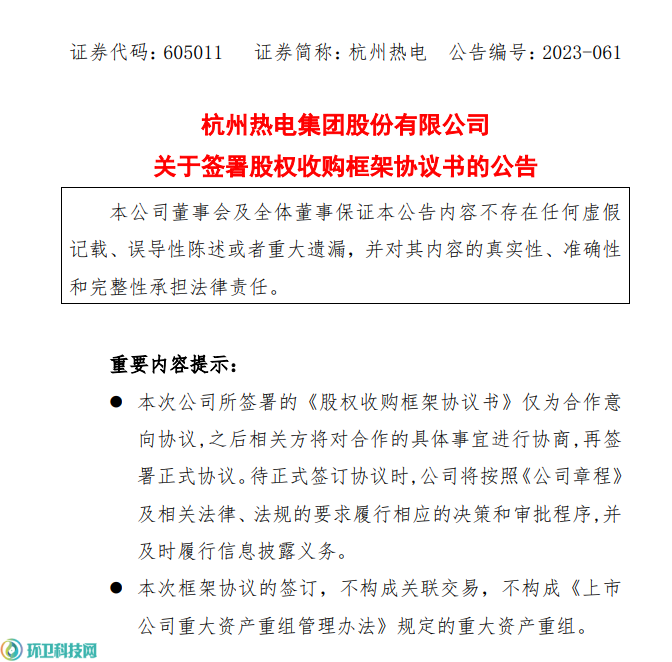 杭州热电(证券代码:605011)发布公告,公司于10月10日签署了《股权收购框架协议书》,拟现金收购杭州新世纪能源环保工程股份有限公司持有的杭州临安绿能环保发电有限公司51%股权。