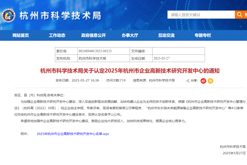 日前,杭州市科学技术局发布《关于认定2025年杭州市企业高新技术研究开发中心的通知》,杭州热电旗下临江环保申报的“高效节能热电联产企业高新技术研究开发中心”,成功认定为“2025年杭州市企业高新技术研究开发中心”,标志着公司在科技创新领域迈出重要一步。