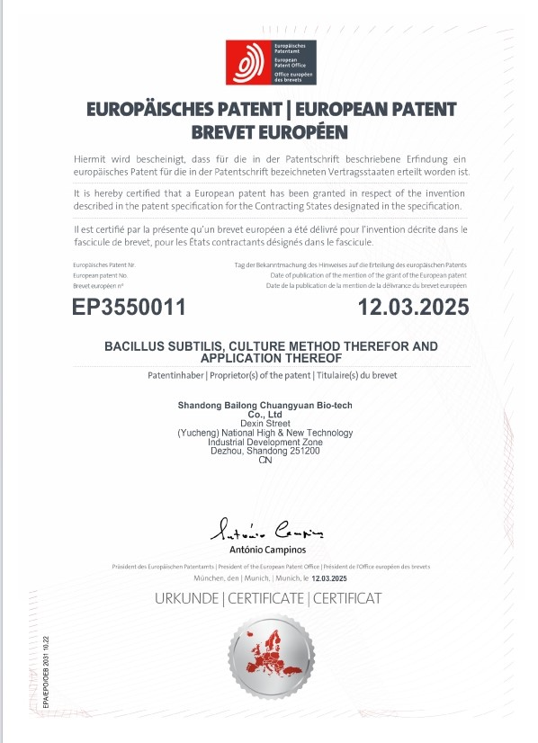 欧洲专利的授权,是对百龙创园科研实力和创新成果的国际认可。这不仅意味着该技术在欧洲市场获得了法律保护,更彰显了百龙创园在全球微生物技术领域的竞争力。它将激励百龙创园继续加大研发投入,不断探索创新,为行业发展贡献更多智慧和力量。