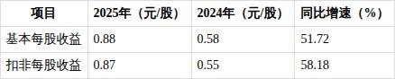 2025年公司实施资本公积转增股本,每10股转增3股,总股本从3.23亿股增至4.20亿股。在此基础上,基本每股收益为0.88元/股,同比增长51.72%;扣非每股收益0.87元/股,同比增长58.18%,每股收益增速与净利润增速基本匹配,股本转增未对每股收益造成明显摊薄影响。