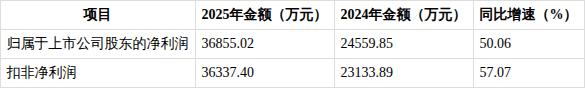 2025年公司实现归属于上市公司股东的净利润3.69亿元,同比增长50.06%;扣除非经常性损益的净利润3.63亿元,同比增长57.07%,盈利增速远超营收增速,盈利能力大幅提升。