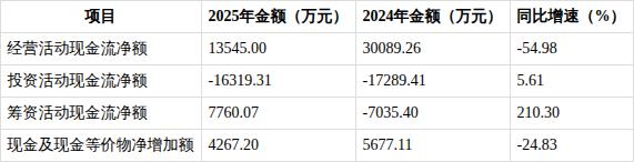2025年公司现金及现金等价物净增加额4267.20万元,同比减少24.83%,现金流结构出现明显变化。-经营活动产生的现金流量净额:1.35亿元,同比减少54.98%,主要因报告期内美元定期存款增加,导致经营活动现金流入受限。-投资活动产生的现金流量净额:-1.63亿元,同比增加5.61%,主要因购买理财产品减少,投资支出规模下降。-筹资活动产生的现金流量净额:7760.07万元,同比增长210.30%,由上年的-7035.40万元转为正数,主要系报告期内银行借款增加,筹资规模扩大。