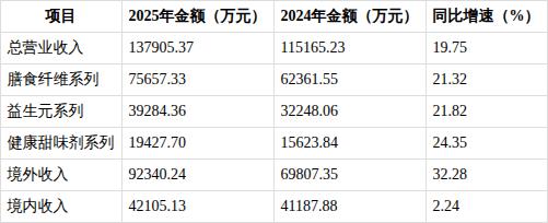 2025年百龙创园实现营业收入13.79亿元,同比增长19.75%,连续三年保持两位数增长。分产品看,膳食纤维系列仍是营收主力,实现收入7.57亿元,同比增长21.32%,占总营收的54.9%;益生元系列收入3.93亿元,同比增长21.82%;健康甜味剂系列收入1.94亿元,同比增长24.35%,增速领先各产品线。
