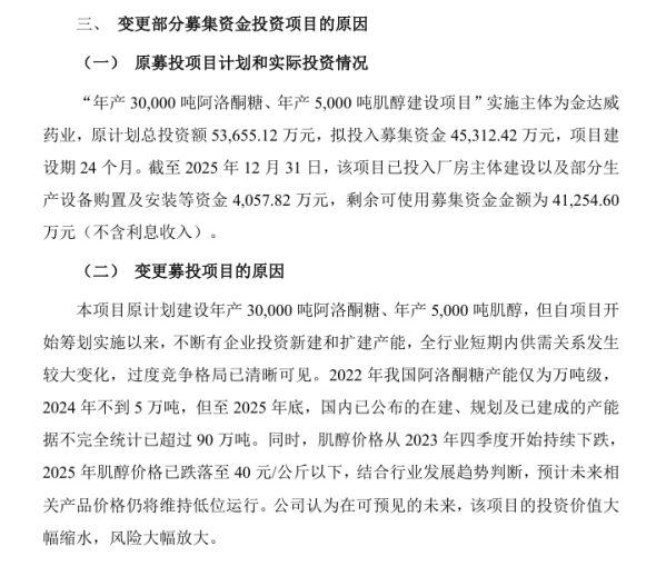 今年1月9日,金达威在《关于变更部分募集资金投资项目的公告》中宣布取消原计划投资超4.5亿元的“年产30000吨阿洛酮糖及5000吨肌醇建设项目”,公告指自筹划项目以来,全行业短期内供需关系发生较大变化,过度竞争格局已清晰可见,2022年我国阿洛酮糖产能仅为万吨级,2024年不到5万吨,但至2025年底,国内已公布的在建、规划及已建成的产能据不完全统计已超过90万吨。