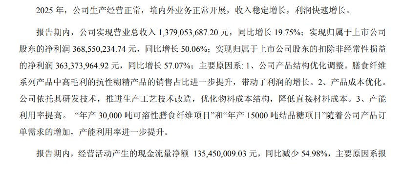 报告期内,百龙创园依托研发技术优势,持续推进生产工艺改造,优化物料成本结构,随着年产30000吨可溶性膳食纤维项目、年产15000吨结晶糖项目产能利用率持续提升,规模效应逐步显现,带动整体毛利率大幅攀升。2025年公司综合毛利率达到42.28%,较上年同期提升7.93个百分点。