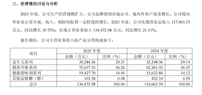 从主营业务构成来看,膳食纤维系列依旧是公司第一大收入来源,2025年实现营收7.57亿元,占主营业务收入比重达56.26%,同比增长21.32%,其中高毛利的抗性糊精产品销售占比进一步提升,成为拉动利润增长的关键。益生元系列实现营收3.93亿元,占比29.21%,同比增长21.82%,健康甜味剂系列实现营收1.94亿元,占比14.45%,同比增长24.35%,保持了较快的增长速度。