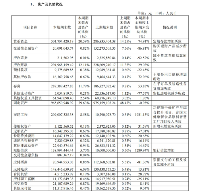 值得注意的是,公司营收增长主要依赖销量提升与产品结构优化,高毛利的抗性糊精销售占比提升带动毛利率上涨7.93个百分点至42.28%,但盈利增长并没有转化成实打实的现金流入。