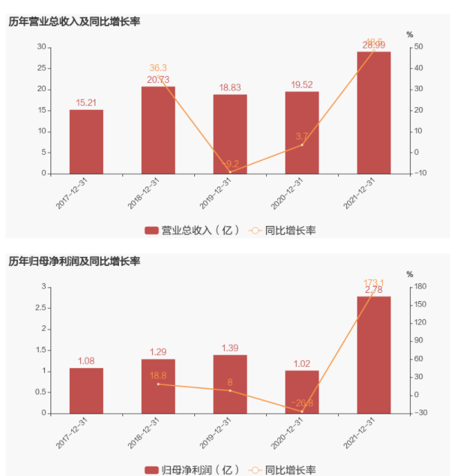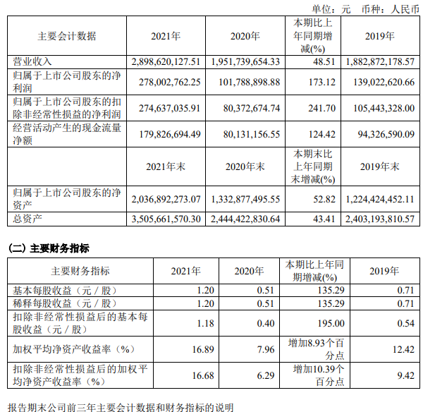 2022年3月30日,永和股份(605020)发布2021年年度报告全文。报告显示,2021年,永和股份(605020)实现营收 28.99亿元,同比增长48.51%;净利润2.78亿元,同比增长173.37%;实现归属于上市公司股东的净利润2.78亿元,同比增长173.11%;基本每股收益为1.20元;平均净资产收益率ROE为16.50%。