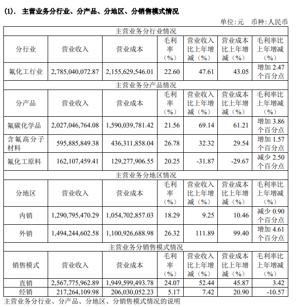 2021 年氟化工产品价格一路飙升,国内外需求增长加速。公司根据市场需求,及时调整产品结构和销售策略,抢占国内外市场份额,取得优异成绩。2021 年度公司主营业务收入 278,504.01