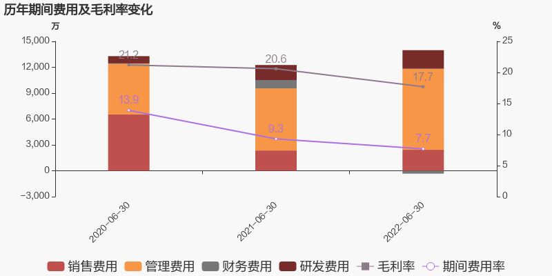 公司2022半年度营业成本14.53亿元,同比增长39.1%,高于营业收入34.2%的增速,导致毛利率下降2.9%。期间费用率为7.7%,较去年下降1.6%。