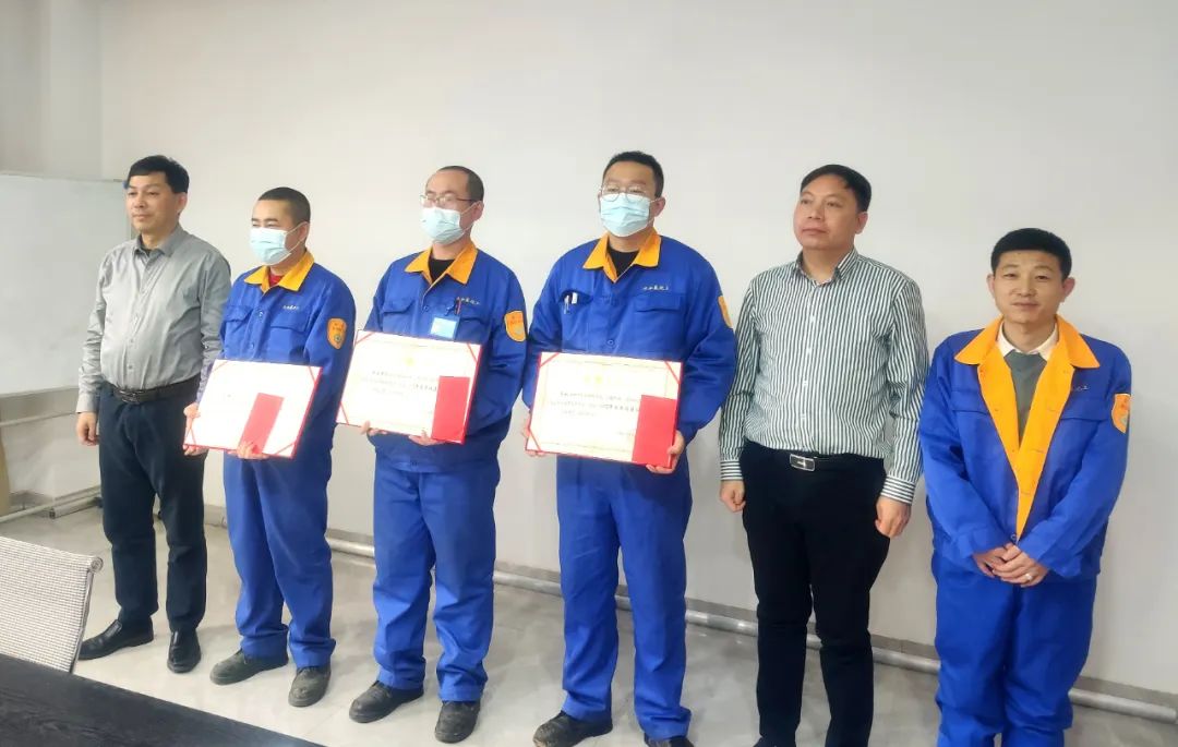 公司领导童嘉成(左二)、赵景平(左一)、朱永涛(右一)为年度优秀员工颁奖
