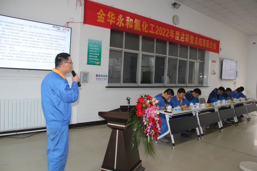 1月13日下午,金华永和氟化工召开了2022年度述职大会暨总结表彰大会,永和股份董事长童建国、集团总经理助理兼邵武永和董事长谢东颖、集团总经理助理兼研究中心总经理赵景平,金华永和董事长傅招祥、总经理陈华宇、总工程师葛濯非、总经理助理陈亮、黄邦力出席会议,全体先进个人、先进班组代表、先进集体代表参加会议,会议由总经理助理陈亮主持。