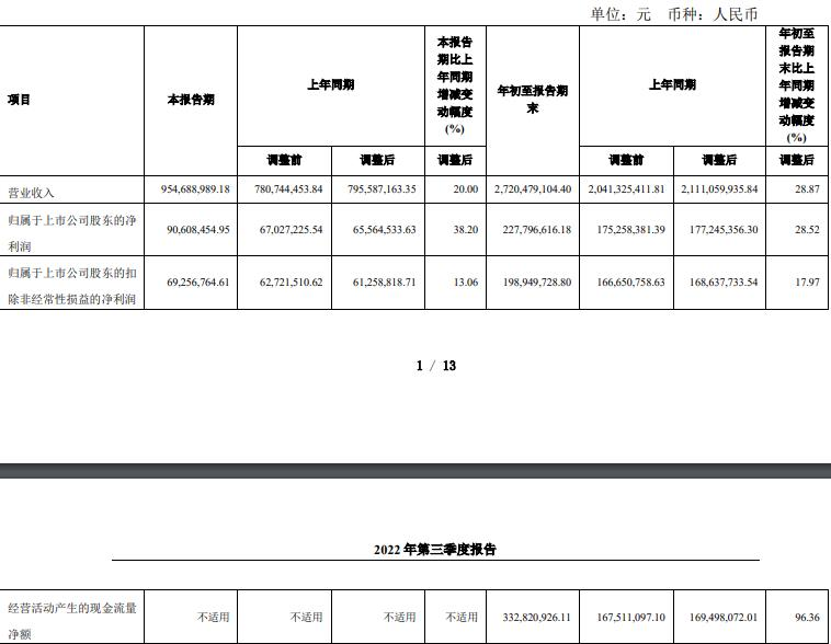 据永和股份2022年三季报,去年第三季度,公司实现营业收入9.55亿元,同比增长20.00%;实现归属于上市公司股东的净利润9060.85万元,同比增长38.20%;实现归属于上市公司股东的扣除非经常性损益的净利润6925.68万元,同比增长13.06%。