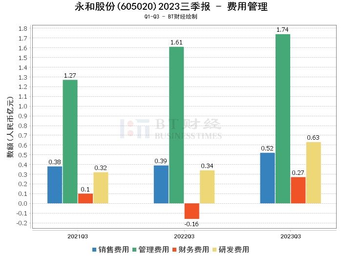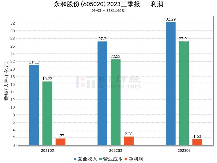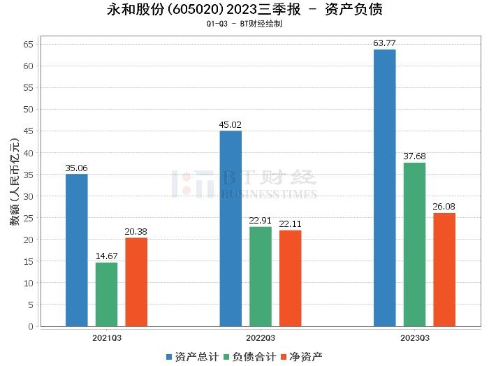 在资产负债方面,2023年三季度末,永和股份的总资产为63.77亿元,相比上年度末的53.54亿元增长了19.10%。负债合计为37.68亿元,相比上年度末的28.44亿元增加了。净资产为26.08亿元,相比上年度末的25.1亿元有所增长。资产负债率为59.09%,相比上年度末的53.11%有所上升。