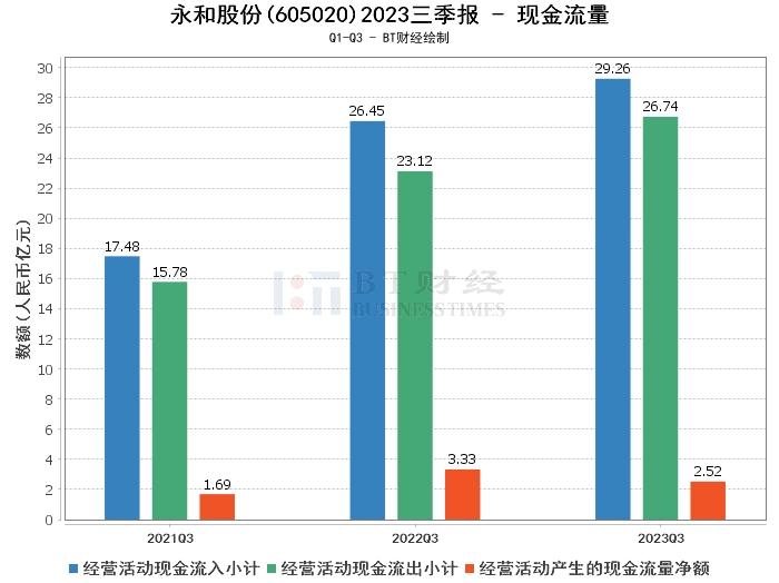 在现金流量方面,2023年1-9月,公司经营活动产生的现金流量净额为2.52亿元,相比上年同期的3.33亿元下降了24.25%。经营活动现金流入小计为29.26亿元,相比上年同期的26.45亿元有所增长。经营活动现金流出小计为26.74亿元,相比上年同期的23.12亿元有所增加。