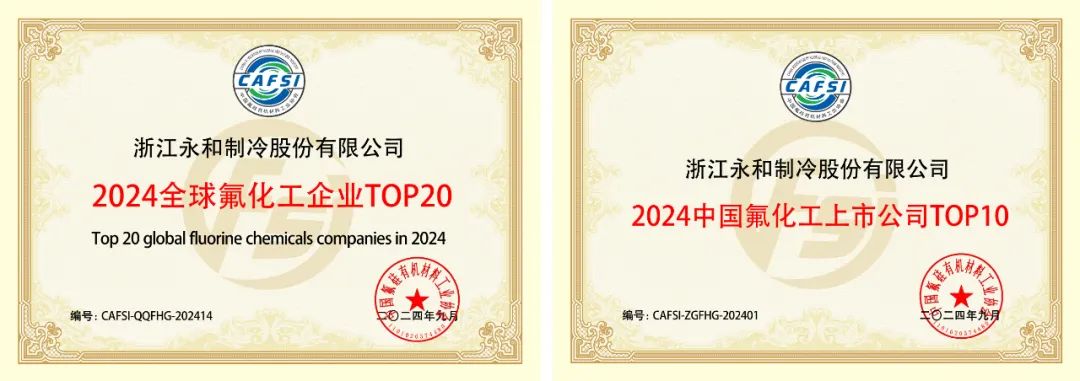 近期,在山东淄博市召开的“2024中国高青·先进氟材料技术与应用创新交流会议”上,中国氟硅有机材料工业协会重磅发布了“2024全球氟化工企业TOP20”及“2024中国氟化工上市公司TOP10”两大榜单,永和股份均成功入选。