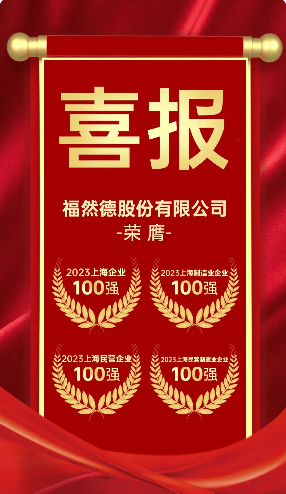 福然德股份有限公司荣登2023上海企业100强、2023上海制造业企业100强、2023上海民营企业100强、2023上海民营制造业企业100强榜单。