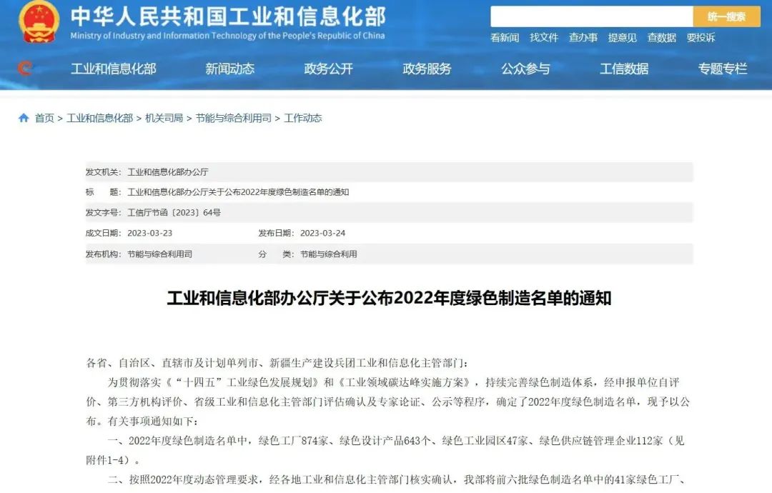 正式公布“2022年度绿色制造名单”