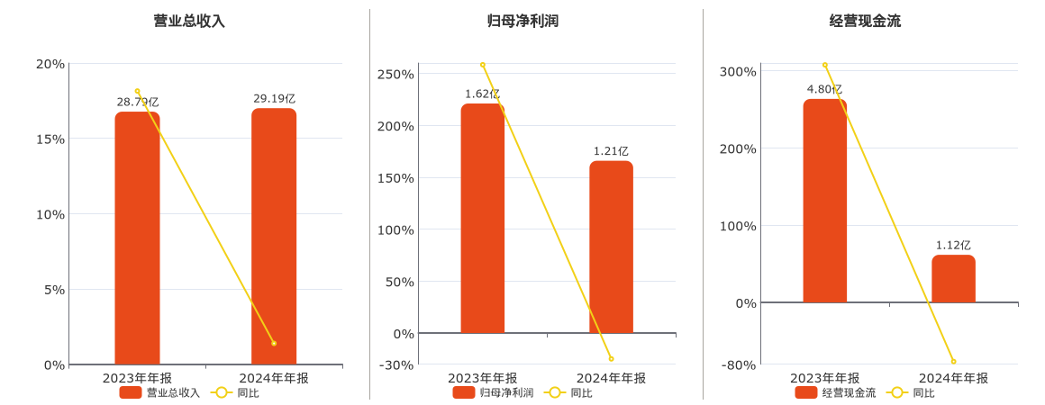 公司营业总收入为29.19亿元。归母净利润为1.21亿元,较去年同报告期归母净利润减少4033.37万元,同比较去年同期下降24.94%。经营活动现金净流入为1.12亿元,较去年同报告期经营活动现金净流入减少3.68亿元,同比较去年同期下降76.60%。