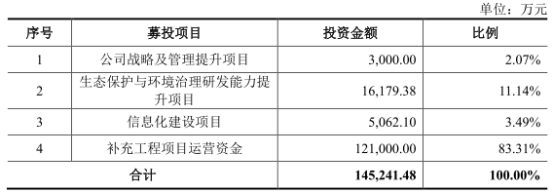 正和生态本次发行募集资金总额为6.16亿元,扣除发行费用后,募集资金净额为5.29亿元。正和生态最终募集资金净额比原计划少9.24亿元。正和生态8月4日披露的招股书显示,公司拟募集资金14.52亿元,计划分别用于公司战略及管理提升项目、生态保护与环境治理研发能力提升项目、信息化建设项目、补充工程项目运营资金。