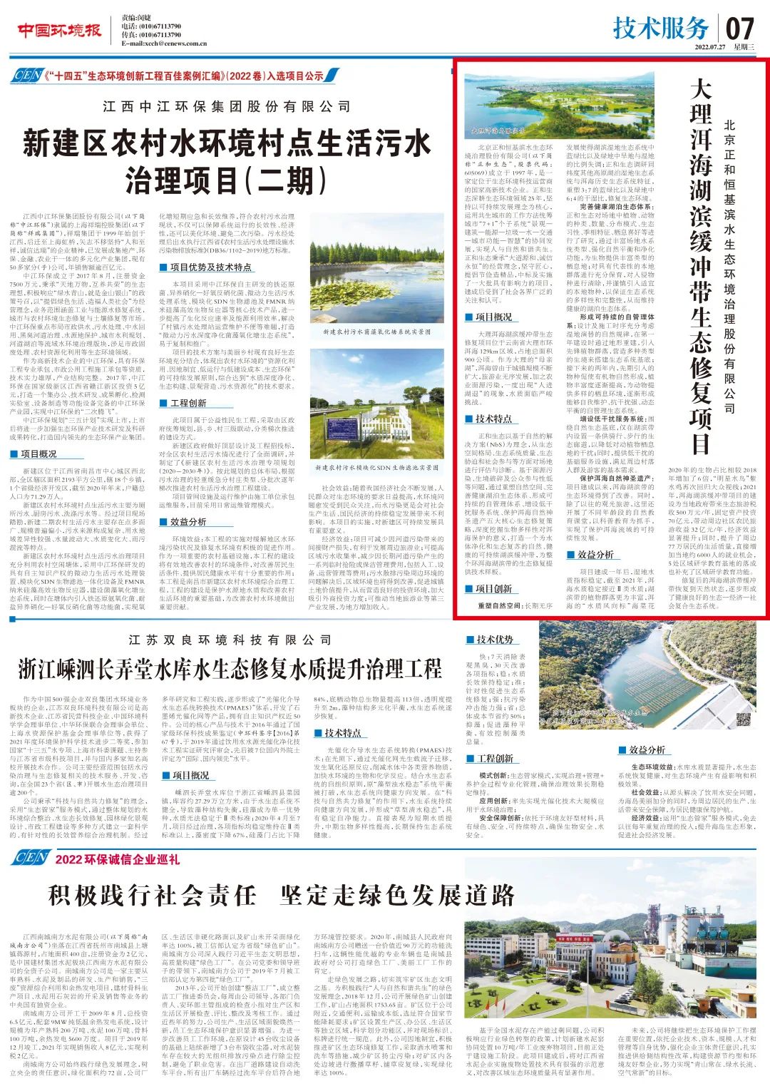 7月27日《中国环境报》对正和生态大理洱海湖滨缓冲带生态修复项目刊登公示