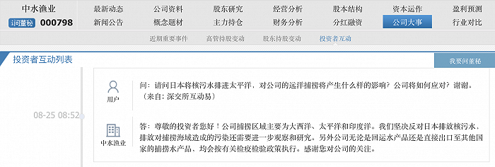 中水渔业(000798.SZ)有回应表示,公司捕捞区域主要为大西洋、太平洋和印度洋。坚决反对日本排放核污水,排放对捕捞海域造成的污染还需要进一步观察和研究。另外公司无论是回运水产品还是直接出口至其他国家的捕捞水产品,均会按有关检疫检验政策执行。