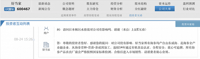 好当家(600467.SH)日前也在互动平台上表示,日本核污水排放对公司没有影响,好当家所有海参均产自山东威海,是海参全产业链企业,从海参育种-育苗-养成到加工,连续14年通过有机食品认证,全程安全、放心可追溯,所有海参产品在出厂前会严格按照国家标准检测,合格后进入市场销售。