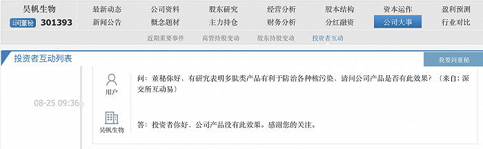 昊帆生物(301393.SZ)在投资者问及公司产品是否“有利于防治各种核污染”时,公司表示自家产品没有此效果。