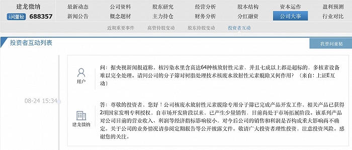 建龙微纳(688357.SH)在互动平台上称,自己核废水放射性元素脱除专用分子筛已完成产品开发工作,相关产品已获得2项国家发明专利授权,自市场开发阶段以来,已产生少量销售,目前尚处于市场拓展阶段。