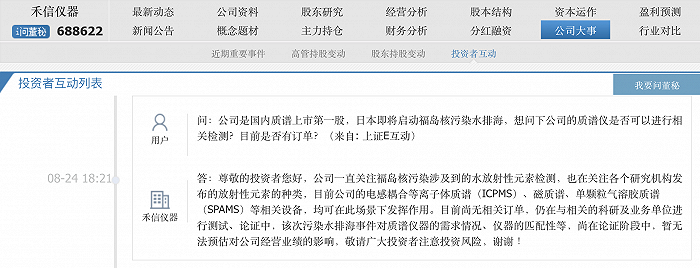 禾信仪器(688622.SH)在互动平台上也有表示,公司一直关注福岛核污染涉及到的水放射性元素检测,也在关注各个研究机构发布的放射性元素的种类,目前公司的电感耦合等离子体质谱(ICPMS)、磁质谱、单颗粒气溶胶质谱(SPAMS)等相关设备,均可在此场景下发挥作用。目前尚无相关订单,仍在与相关的科研及业务单位进行测试、论证中,该次污染水排海事件对质谱仪器的需求情况、仪器的匹配性等,尚在论证阶段中,暂无法预估对公司经营业绩的影响。