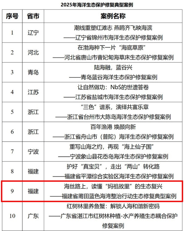 近日,自然资源部公布2025年海洋生态保护修复典型案例评选结果,全国共评选出15个典型案例。其中,正和生态项目“海丝路上读懂‘妈祖故里’的生态复兴——福建省莆田蓝色海湾整治行动生态修复典型案例”成功入选,标志着公司滨海生态修复实践的示范性与创新性获得专业肯定。