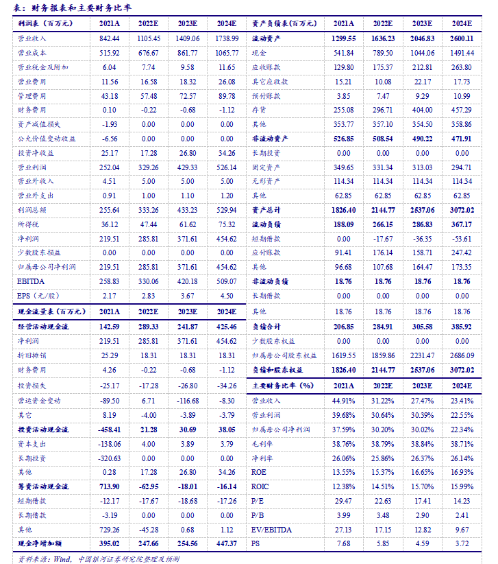 费用率方面,报告期内,公司期间费用率为4.53%,同比下降3.62 pct。其中,销售/管理/研发/财务费用率分别为1.17%/ 3.86%/ 2.3%?/-2.8%,分别同比变动-1.3 pct /-0.04 pct /+0.15 pct /-2.43 pct。其中,公司销售费用率与财务费用率降幅明显,主要原因为:1)受疫情影响,展会费用、业务招待费及差旅费减少;2)本期人民币兑美元汇兑收益带来财务费用大幅减少。净利率方面,2022年上半年,公司净利率为27.42%,同比下降0.32 pct;22Q2单季公司净利率为28.67%,同比上涨0.64 pct,环比上涨2.41 pct。
