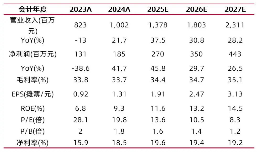 2024年营收及业绩快速增长,2025Q1增长进一步提速。营收端,2024年,公司实现营业收入10.02亿元,同比增长21.75%,其中2024Q4营收为2.12亿元,同比增长39.44%。2025Q1,公司实现营业收入3.57亿元,同比增长30.40%。业绩端,2024年,公司实现归母净利润1.85亿元,同比增长41.67%,其中2024Q4归母净利润为0.22亿元,同比增长849.63%。2025Q1,实现归母净利润0.96亿元,同比增长148.29%。