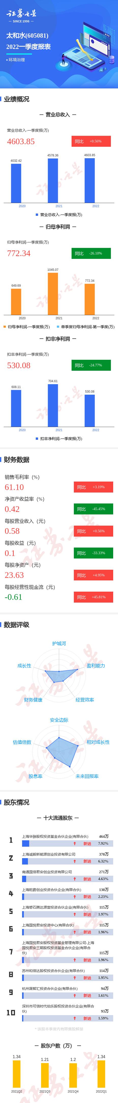 太和水2022一季报显示,公司主营收入4603.86万元,同比上升0.56%;归母净利润772.34万元,同比下降26.1%;扣非净利润530.09万元,同比下降24.77%;其中2022年第一季度,公司单季度主营收入4603.86万元,同比上升0.56%;单季度归母净利润772.34万元,同比下降26.1%;单季度扣非净利润530.09万元,同比下降24.77%;负债率10.89%,财务费用-351.37万元,毛利率61.1%。