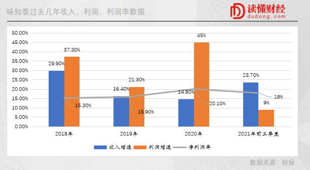 从收入增速来看,味知香2018年至2020年收入同比增长分别为29.9%、16.4%和14.8%;净利润同比增长分别为37.3%、21.3%和45%。2021年前三季度收入同比增长23.7%,净利润同比增长9.2%。