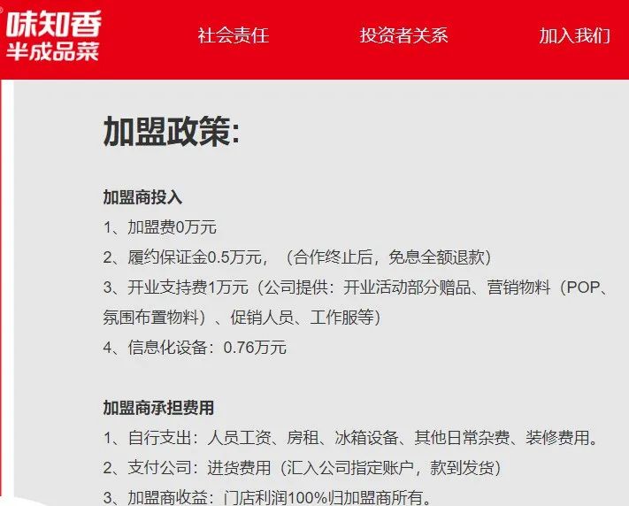 而从店型来看,味知香加盟店的定位更像是夫妻店,比较适合预算较低的创业者。味知香官网发布的加盟条件显示,开一家味知香加盟店无需加盟费,只需要履约保证金5000元、开业支持费10000元、信息化设备0.76万元,装修费用、冰箱设备、房租、人员工资等则由加盟商自行支付。