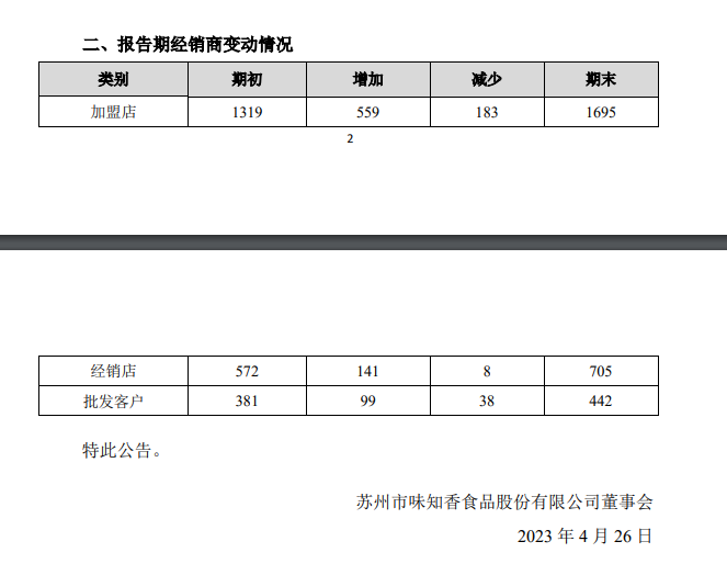 财报披露的数据显示,光是2021年,味知香就关闭了加盟店102家,而当年味知香共新增加盟店304家。2022年味知香新开加盟店559家,关店183家。进入2023年,这一情况并未好转。今年一季度,味知香新开加盟店83家,关店41家。
