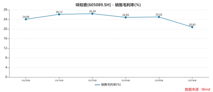 然而二级市场的热度与公司基本面的承压形成鲜明反差,2023年起,公司净利润已连续两年呈现负增长,营收在2024年更是出现自上市以来的首度下滑。经营压力下,虽然味知香也在积极推进各渠道拓展,通过产品调价应对成本波动,但今年上半年仍呈现增收降利局面,其中公司报告内的毛利率跌至20.83%,创下自2021年上市以来中期报告披露的毛利率新低。