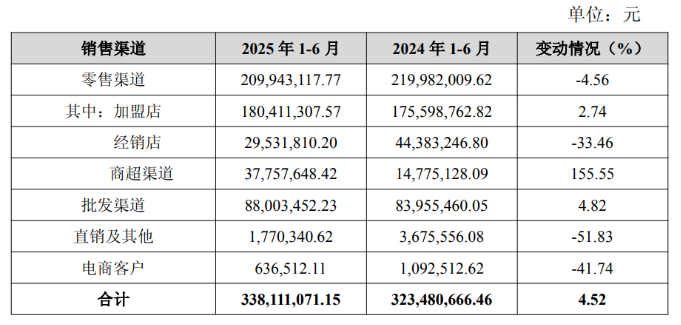 从上半年业绩表现看,味知香不同渠道收入呈现分化,零售渠道继续承压,收入同比下降4.56%至2.1亿元,其中来自加盟店的收入同比小幅增长2.74%至1.8亿元;商超渠道同比增长155.55%至3775.76万元;批发渠道同比增长4.82%至8800.35万元;但经销店增势疲软,同比下滑33.46%至2953.18万元。