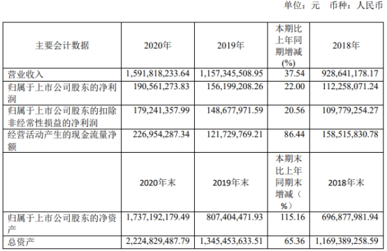 2020年,华丰股份实现营业收入15.92亿元,同比增长37.54%;归属于上市公司股东的净利润1.91亿元,同比增长22.00%;归属于上市公司股东的扣非净利润1.79亿元,同比增长20.56%;经营活动产生的现金流量净额为2.27亿元,同比增加86.44%。