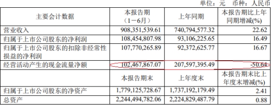 2021年上半年,华丰股份实现营业收入9.08亿元,同比增长22.62%;归属于上市公司股东的净利润1.08亿元,同比增长16.49%;归属于上市公司股东的扣非净利润1.08亿元,同比增长16.67%;经营活动产生的现金流量净额为1.02亿元,同比减少50.64%。