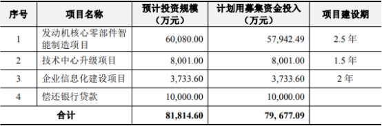 据华丰股份2020年7月28日披露招股书显示,公司此次募集资金分别用于发动机核心零部件智能制造项目、技术中心升级项目、企业信息化建设项目、偿还银行贷款。